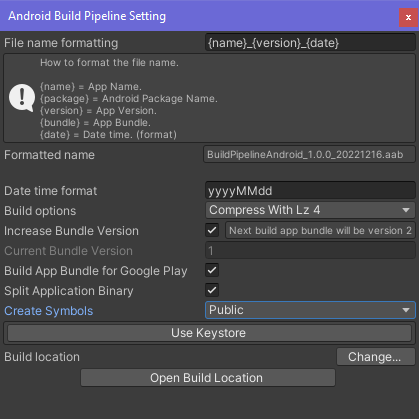 This is a build tools for Unity Editor that easier to use. Include custom format name and auto increment bundle every perform a build. Created by Thanut Panichyotai (@LuviKunG)