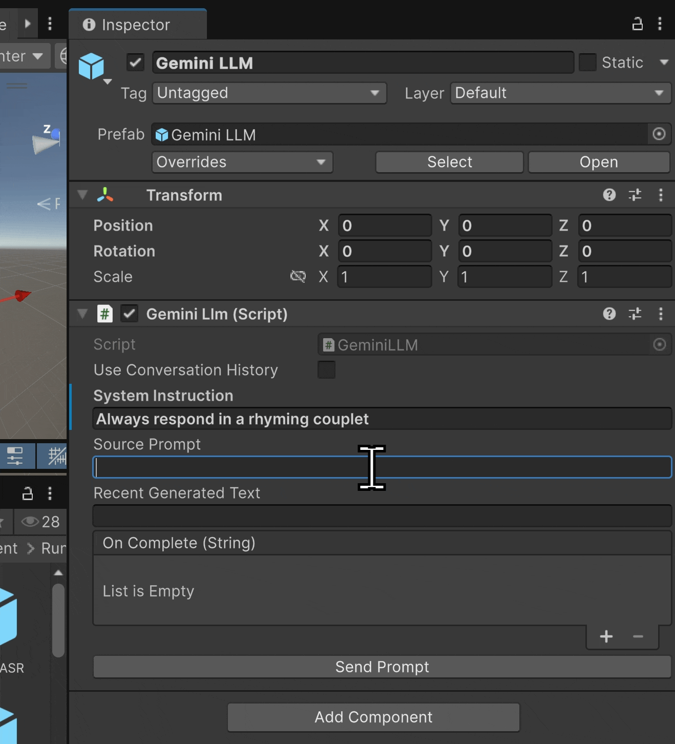 Instead, Embardiment calls upon these services asynchronously. For example, the GeminiLLM class has a UnityEvent named OnComplete. You can add "listener" functions to OnComplete so that anytime GeminiLLM responds with a new text generation (via SendPrompt()), it will call all associated listener functions.