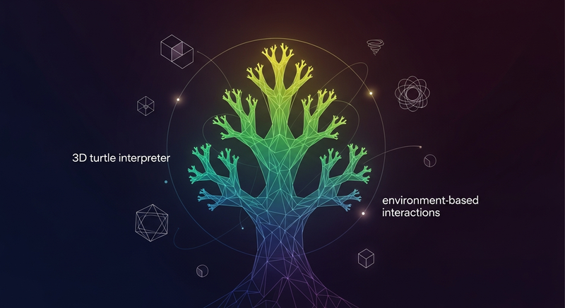 L-system parser and 3D turtle interpreter for procedural plant and organic structure generation in Unity. Features L-system grammar parsing, 3D turtle graphics rendering, and environment-based interactions for simulating plant growth and behavior. Ideal for creating realistic vegetation, procedural environments, and interactive plant simulations.