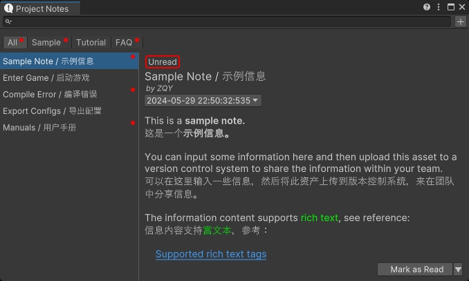 A small utility within the Unity Editor to display notes, which can be used to share information across the team.