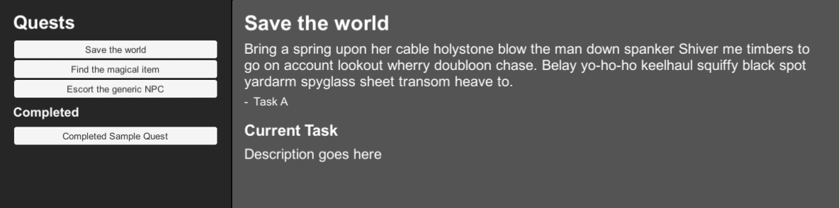 - Quests and tasks as ScriptableObject(s) for easy reference in your inspectors
