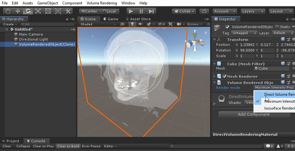 Volume rendering package for Unity. Direct volume rendering, MIP, and isosurface rendering. Imports DICOM, NIFTI, NRRD, ...
