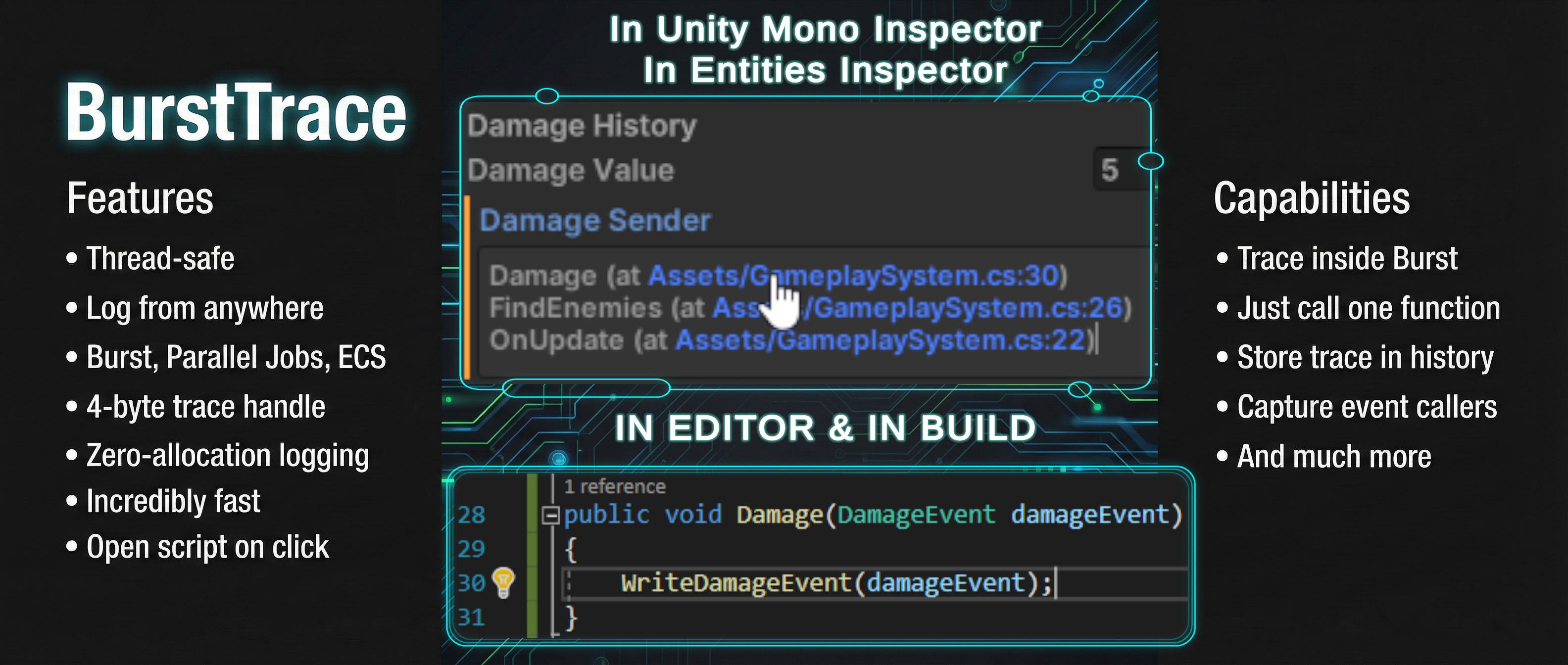 Burst Trace captures and visualizes call stacks in the Unity Inspector, enabling developers to trace execution flow and ...