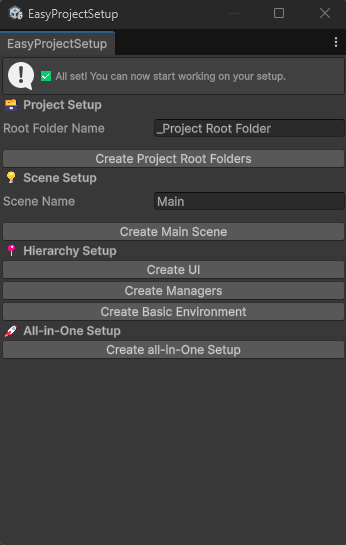 EasyProjectSetup is a Unity Editor tool designed to quickly generate organized project folder structures and base scenes...