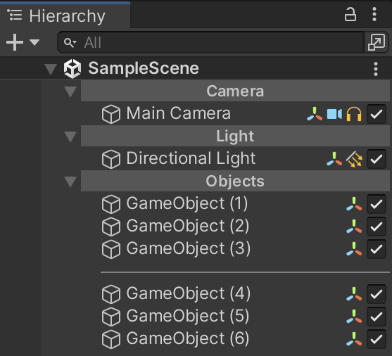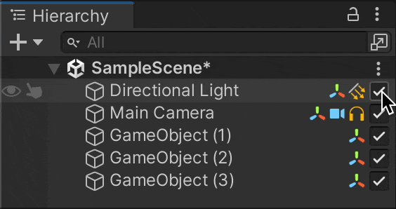 Toggles to switch between active/inactive states of objects and icons to display the components of objects can be added to the Hierarchy. These can be configured from ProjectSettings.