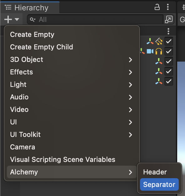 Additionally, objects to decorate the Hierarchy can be created from the Create menu.