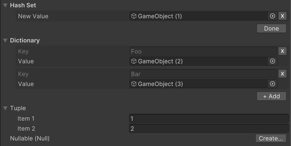 In addition to adding easy and powerful editor extensions based on attributes, it allows serialization of any type (Dictionary, Hashset, Nullable, Tuple, etc...) through its own serialization process, making it possible to edit them in the inspector. By using Source Generator to dynamically generate the necessary code, it works simply by adding attributes to the target type marked as partial. There is no need to inherit from dedicated classes as with Odin.