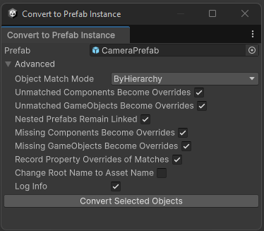 This window provides access to Unity's powerful PrefabUtility.ConvertToPrefabInstance() function. It also adds a handful of capabilities not supported by Unity's default implementation.