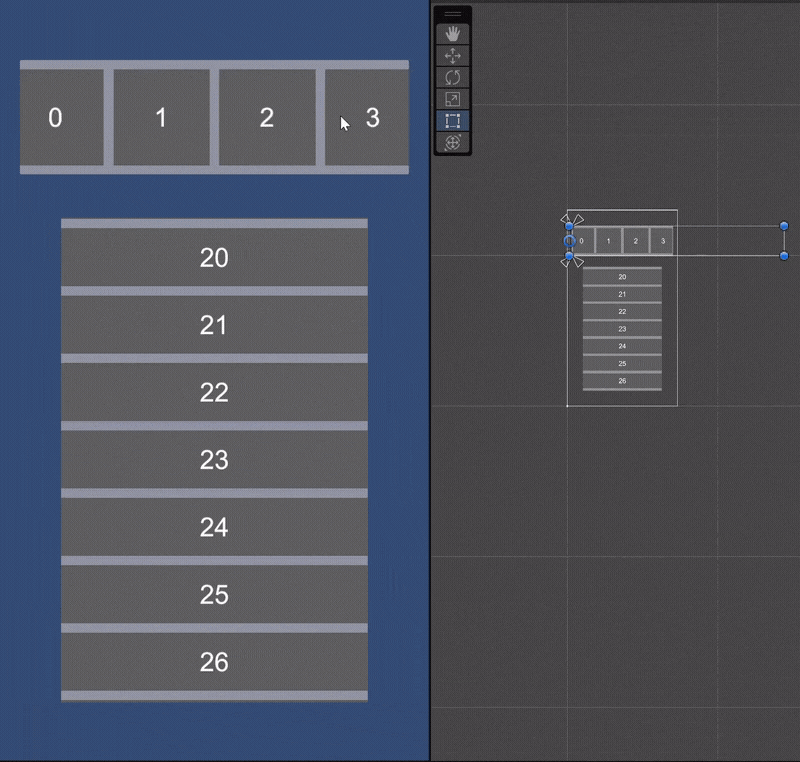 The scroll system optimizes performance by reusing UI elements (GameObjects). Instead of instantiating thousands of objects—which consumes RAM and slows down CPU processing—this system maintains only a small number of elements sufficient to display on the screen and updates their data as the user scrolls.