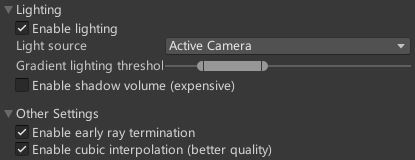 - "Enable lighting": Enable lighting calculations during volume rendering.