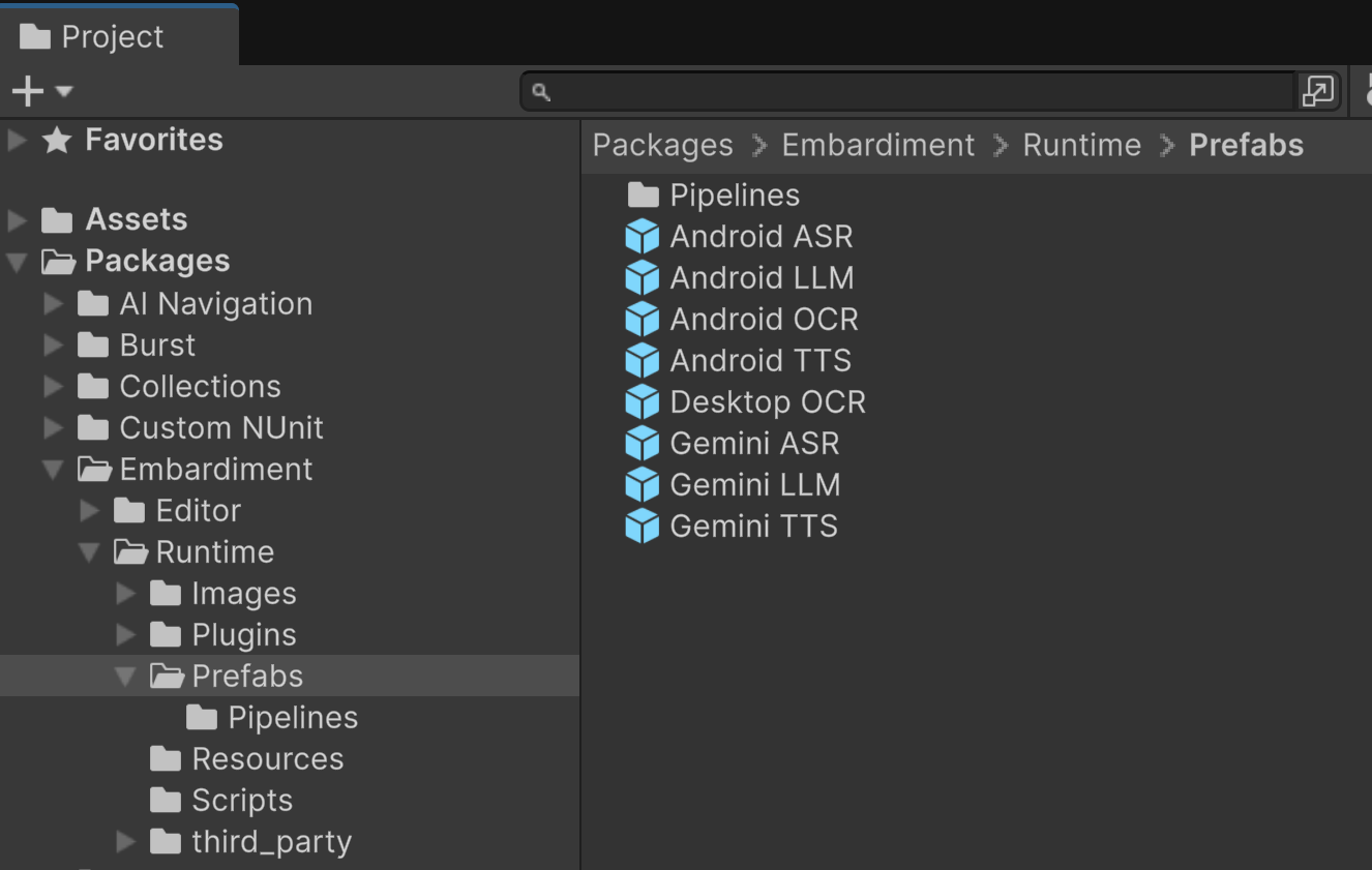 Embardiment will appear in the Unity project under Packages/Embardiment/. Inside this, the most useful things to work with are in Runtime/Prefabs.