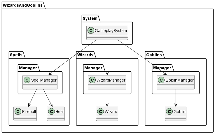 Also, notice how neither the Wizard nor the WizardManager know how a spell is created, managed or destroyed. This gives us the flexibility of using whichever infrastructure we need for ISpell. For example, if we had to use a pre built spell plugin from the asset store, we could define ISpell and ISpellFactory implementations to communicate with it, and the rest of our codebase wouldn't even know.