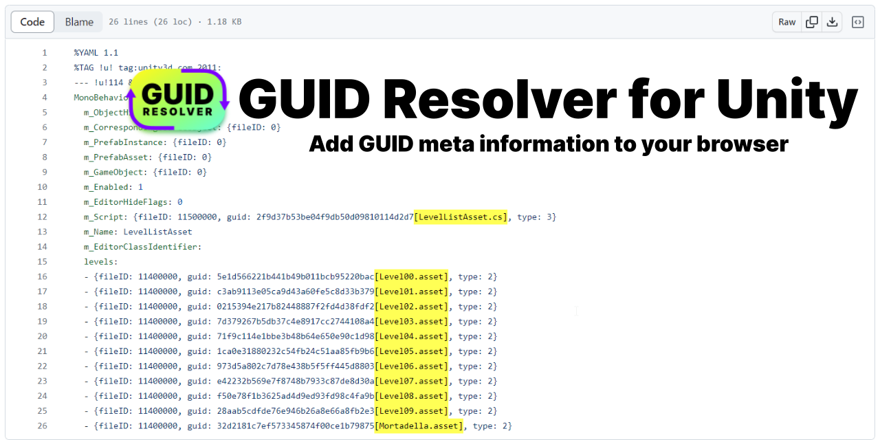 Resolve Unity asset GUIDs to their readable names directly in pull requests and code reviews. Generate a JSON mapping of all GUIDs to asset metadata from your project, then use the browser extension to automatically enrich GitHub, GitLab, and Bitbucket diffs with human-readable filenames. Essential for teams reviewing changes to ScriptableObjects and deeply-referenced assets.