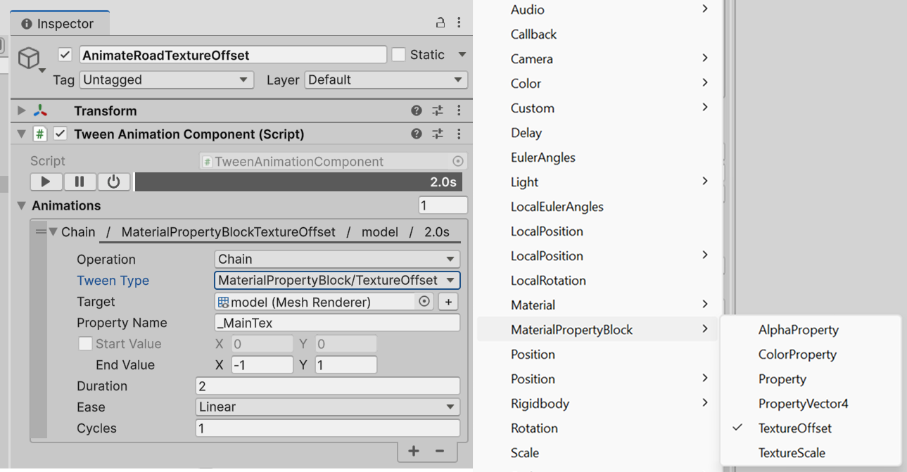 Simply type Tween. and let your IDE suggest all supported animations. Out of the box, PrimeTween can animate almost everything: UI, UI Toolkit, Materials, Camera properties, Transforms, AudioSource, and whatnot.