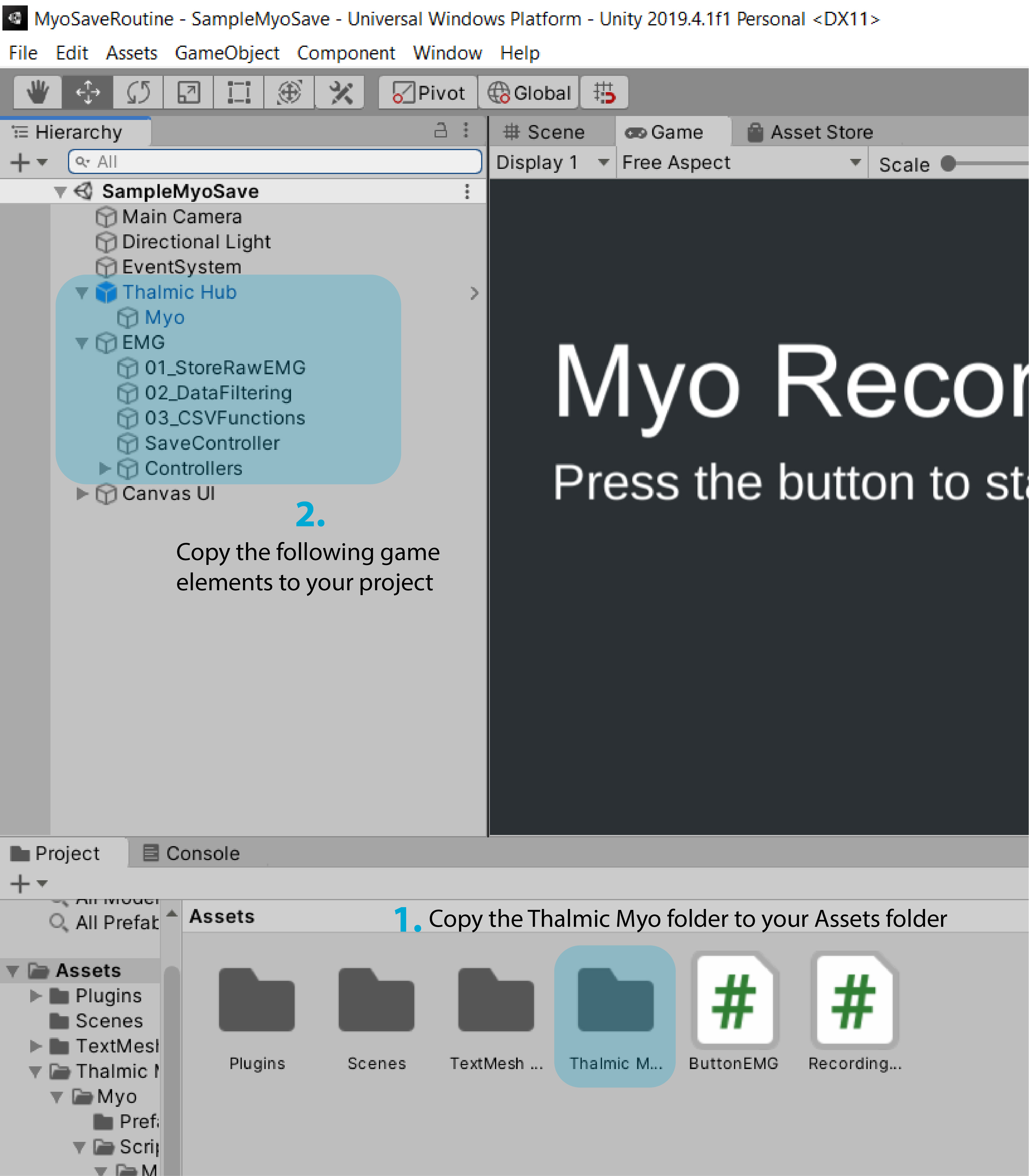 To add the Myo-Unity EMG recorder capabilities to your Unity project: