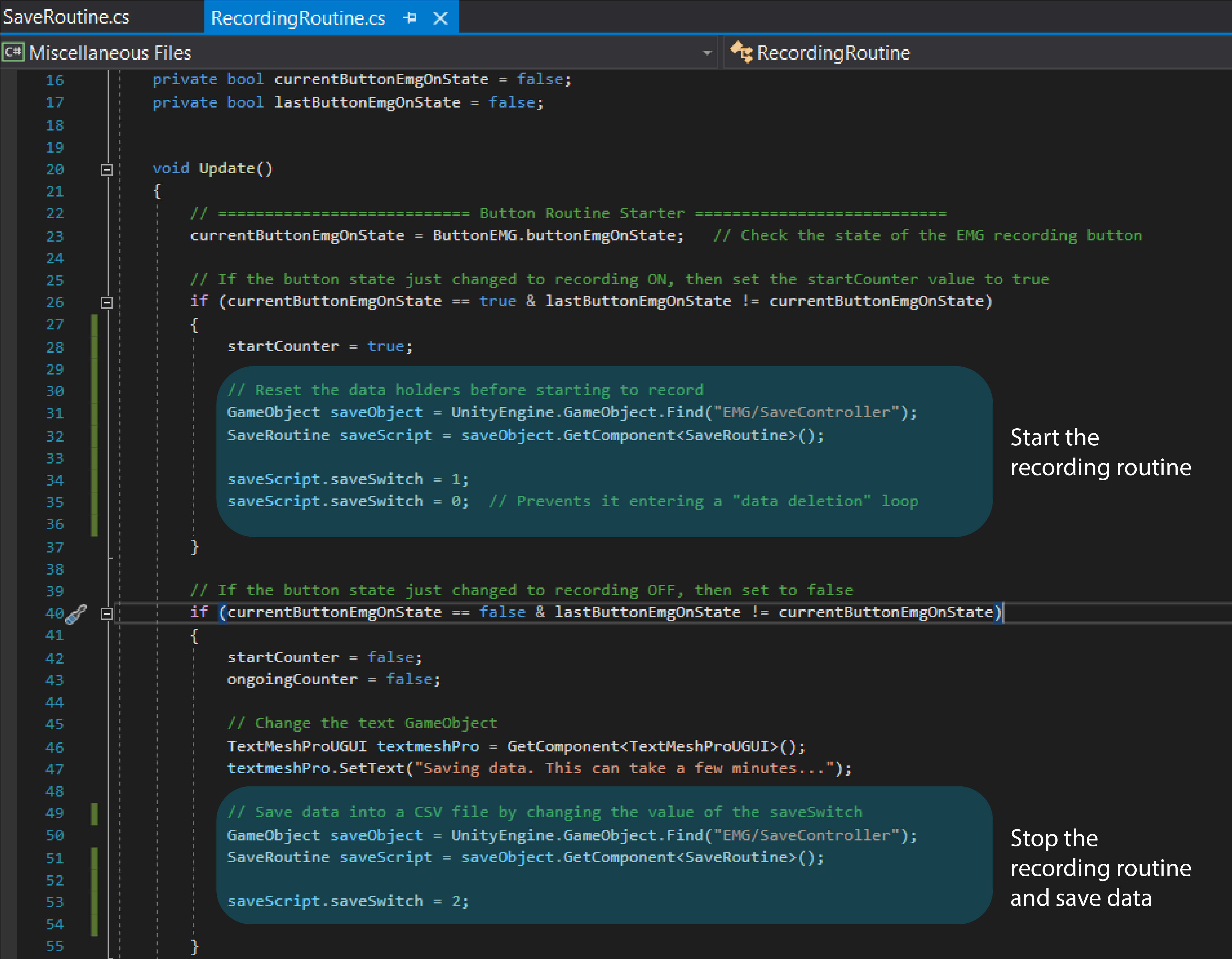 - To control the EMG recording/saving routine, you can access and change the saveSwitch variable value from the /ThalmicMyo/MyoEMG/SaveRoutine.cs file in the following way: