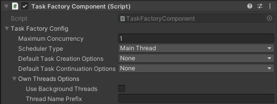 SynchronizationContext, which by default is Unity's Main Thread. Default maximum concurrency isint.MaxValue, that is, process every queued task in a single frame. - ManagedThreadPoolTaskScheduler: