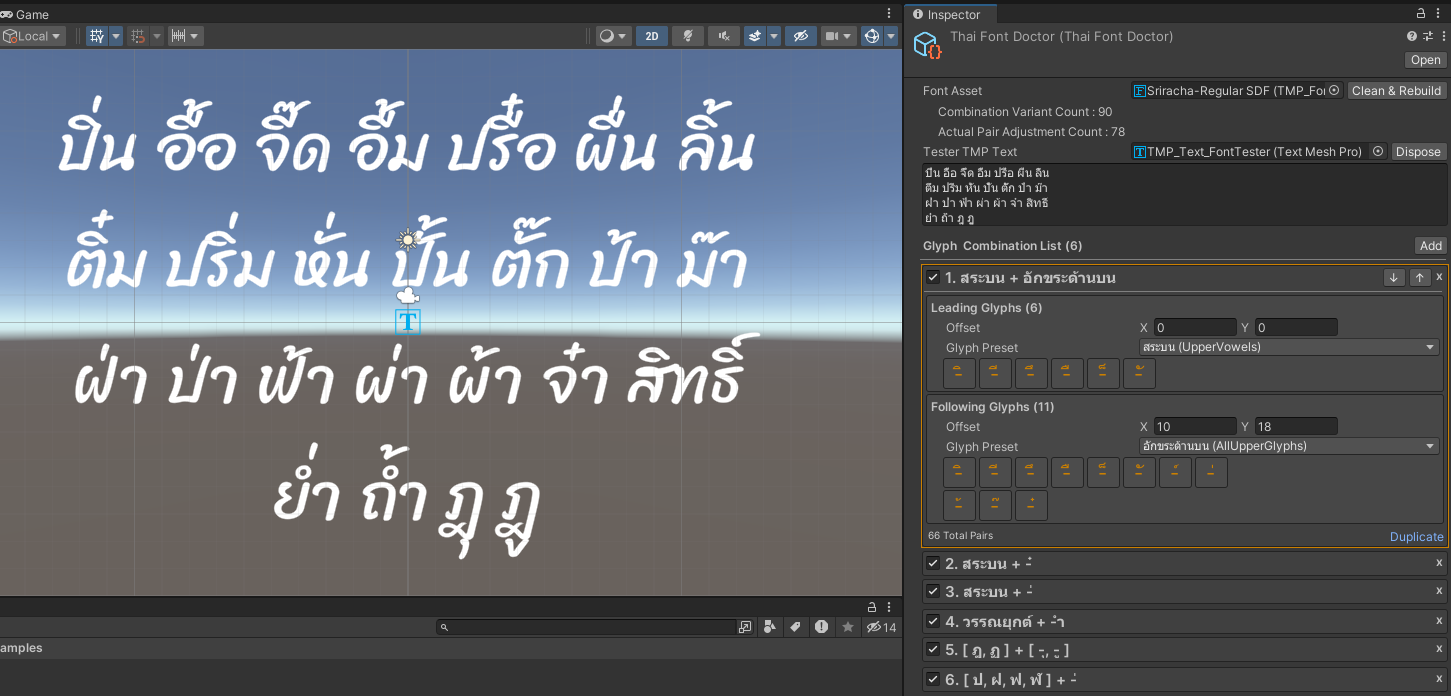 When you set a Glyph Combination, you specify which Thai character glyphs should pair together and the appropriate offset for each pair. ThaiFontDoctor then updates the GlyphAdjustmentTable in your TMP_FontAsset in real-time, making it easy to fine-tune how vowels and tone marks appear in your TMP_Text components.