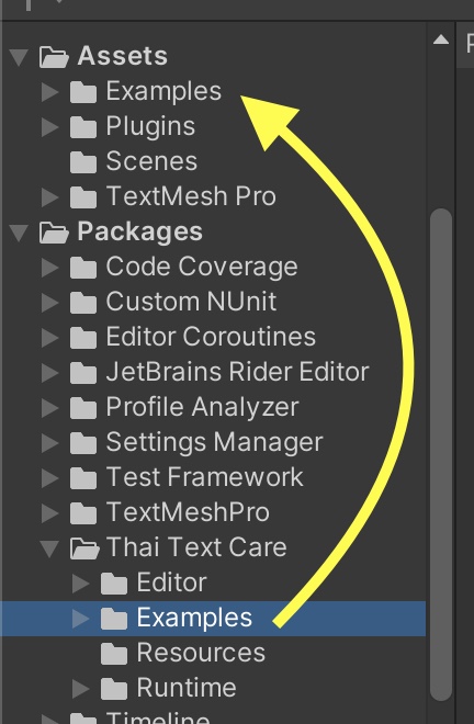.gitignorefile. - To easily copy the example assets into your project, You can drag the Examples folder from under Packages/Thai Text Care/ into the Assets folder.