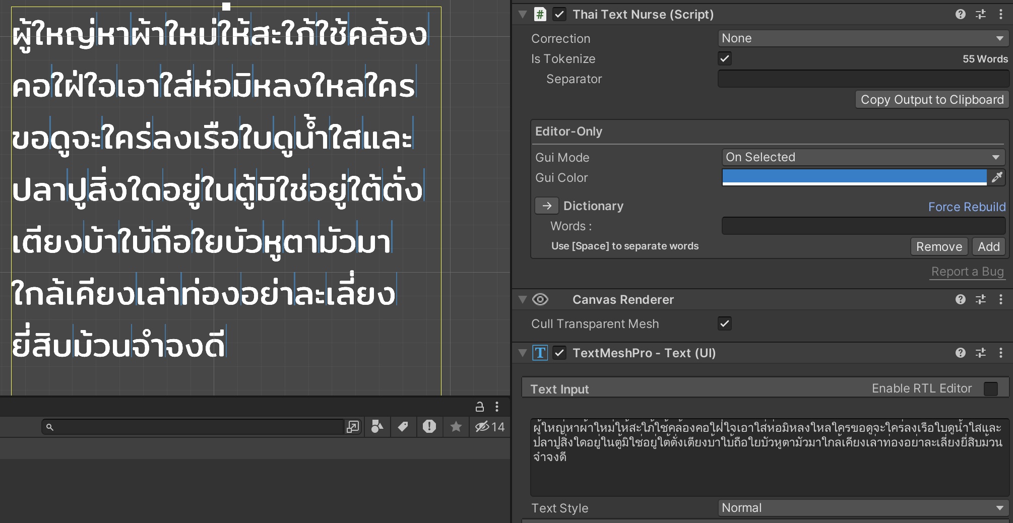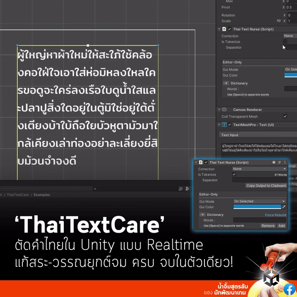 This component tokenizes and separates Thai words on TextMeshPro components using Zero Width Space. Just attach it to any TextMeshPro component and you're all set! It will beautifully wrap the Thai text for you!