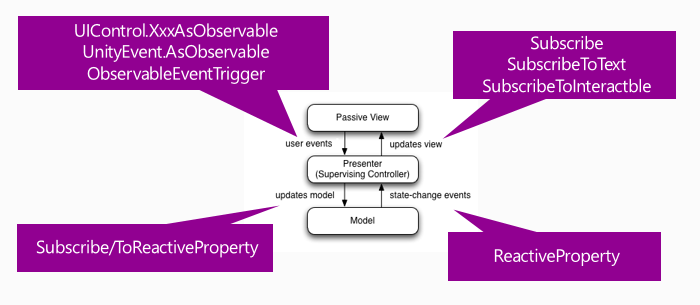 UniRx is Core Library (Port of Rx) + Platform Adaptor (MainThreadScheduler/FromCoroutine/etc) + Framework (ObservableTriggers/ReactiveProeperty/etc).