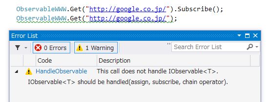 For Visual Studio 2015 users, a custom analyzer, UniRxAnalyzer, is provided. It can, for example, detect when streams aren't subscribed to.