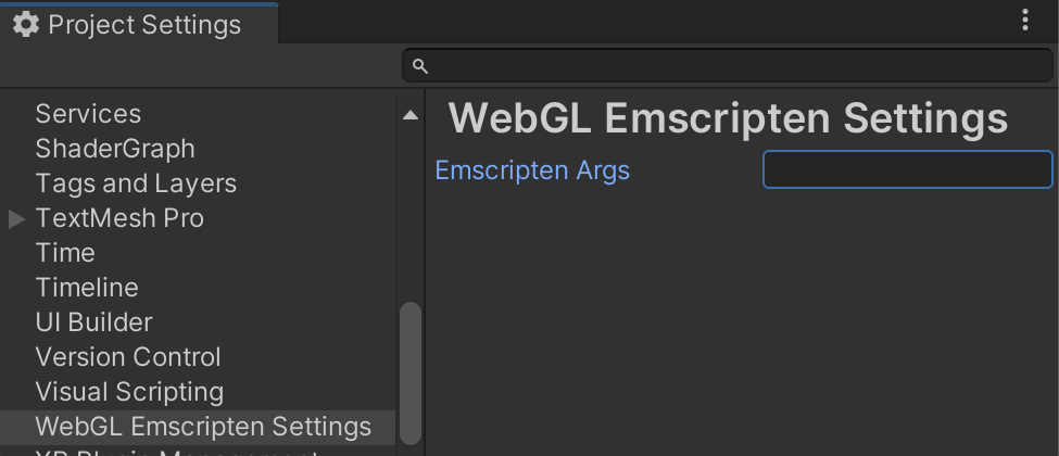 Unity Project Settings tab that shows and allows editing emscripten arguments used when building WebGL projects (PlayerSettings.WebGL.emscriptenArgs).